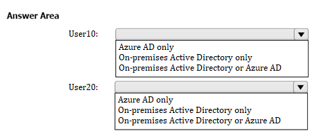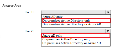 You create a new user named User10 on-premises and a new user named User20 in Azure AD.