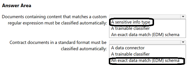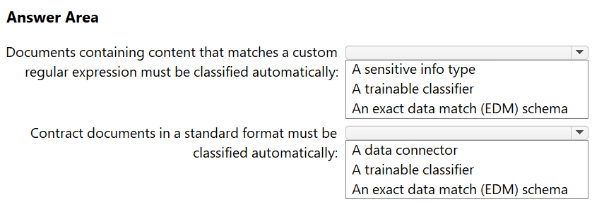 • Documents containing content that matches a custom regular expression must be classified automatically.
