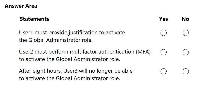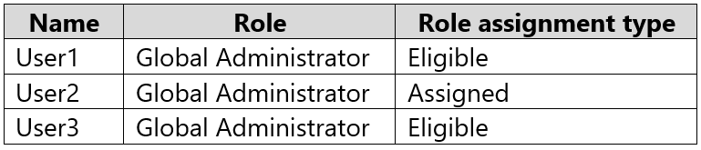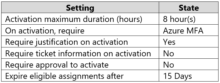 The Global Administrator role has the Privileged Identity Management (PIM) settings shown in the following table.