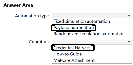 Which type of automation should you use, and which condition should you configure for the Attack simulation training? To answer, select the appropriate options in the answer area.