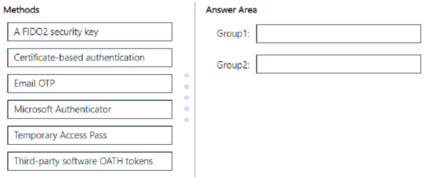 Which authentication method should you recommend for each group? To answer, drag the appropriate methods to the correct groups. Each method may be used once, more than once, or not at all. You may need to drag the split bar between panes or scroll to view content.