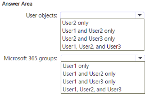 Which users can create user objects, and which users can create Microsoft 365 groups? To answer, select the appropriate options in the answer area.